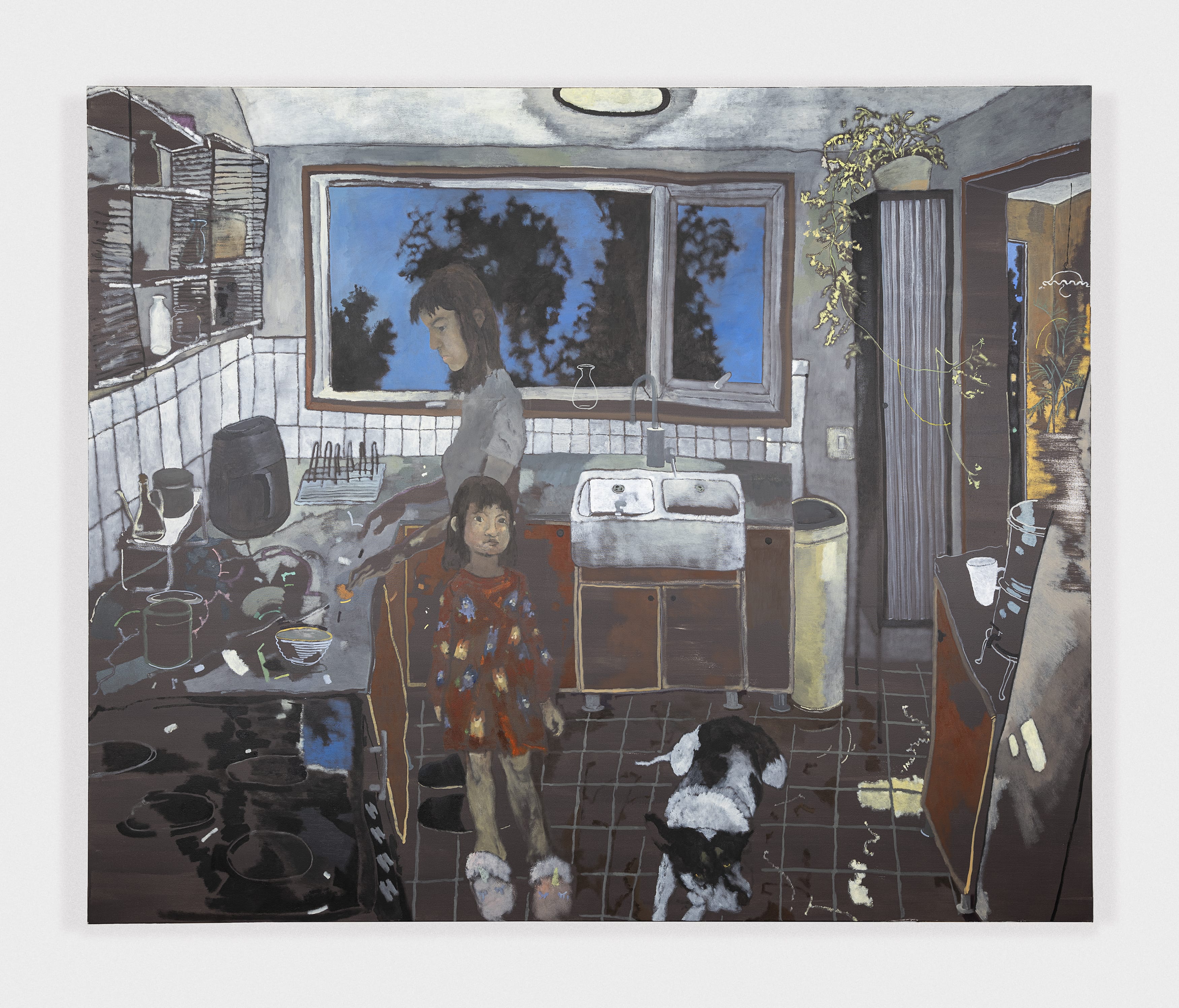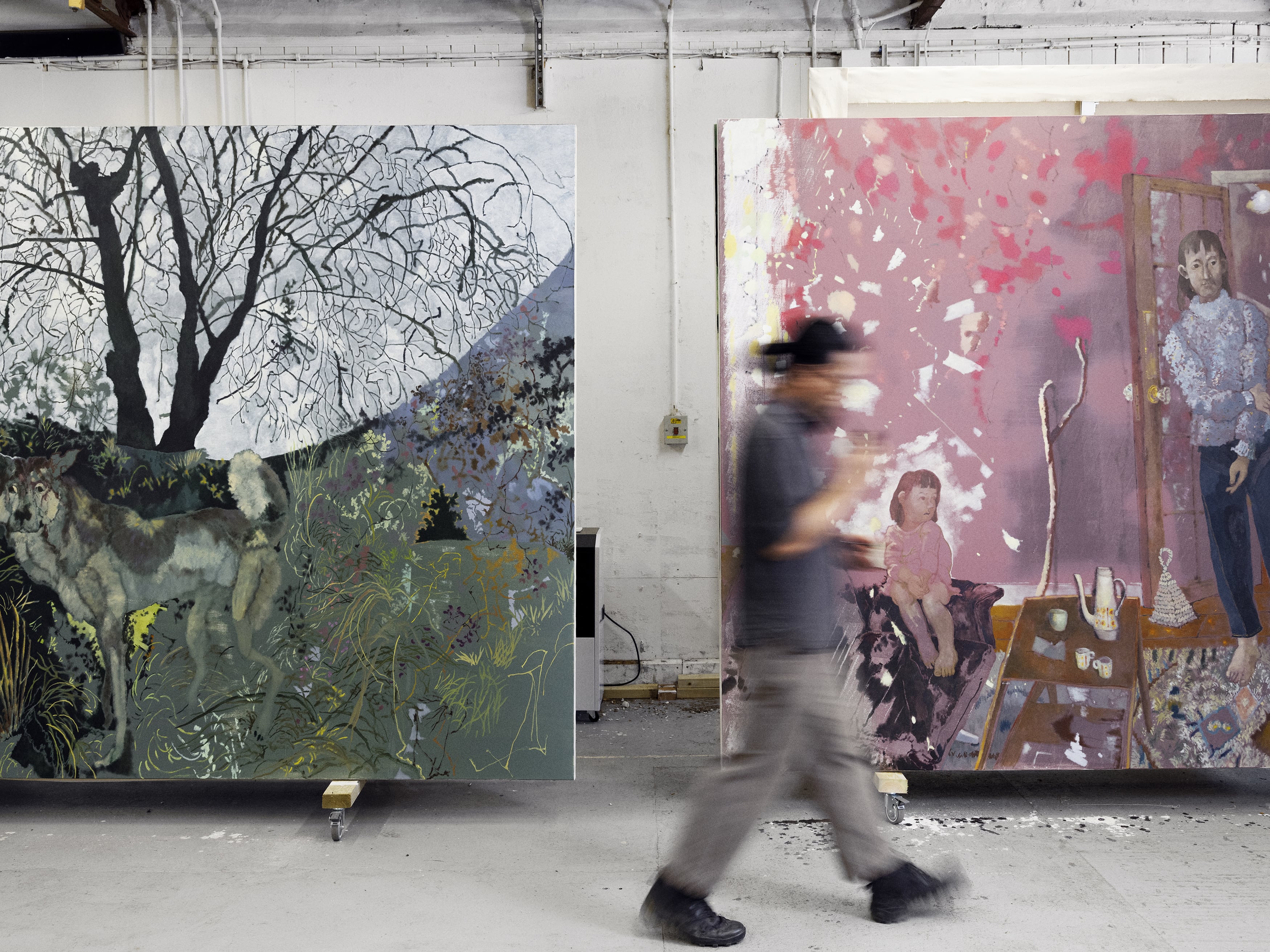 Huen’s large-scale oil paintings, a constellation of brush marks often starring a cast of recurring characters including his wife Haze, son Joel, daughter Tess and dogs Balltsz, MuiMui and Doodood, evolve organically and haphazardly; Huen forgoes underdrawings and sketches, and rather than paint from a photograph or from the scene itself, opts to eternalise the minute and the transient from feeling and memory. Huen’s technique, imbued with both deft abstraction and the hallmarks of traditional Chinese ink painting, involves layering one dab of paint over another until the pattern on the canvas perfectly echoes the spirit of the scene. Through this progress, Huen wants to discover the distance between appearances and our recognition of things.