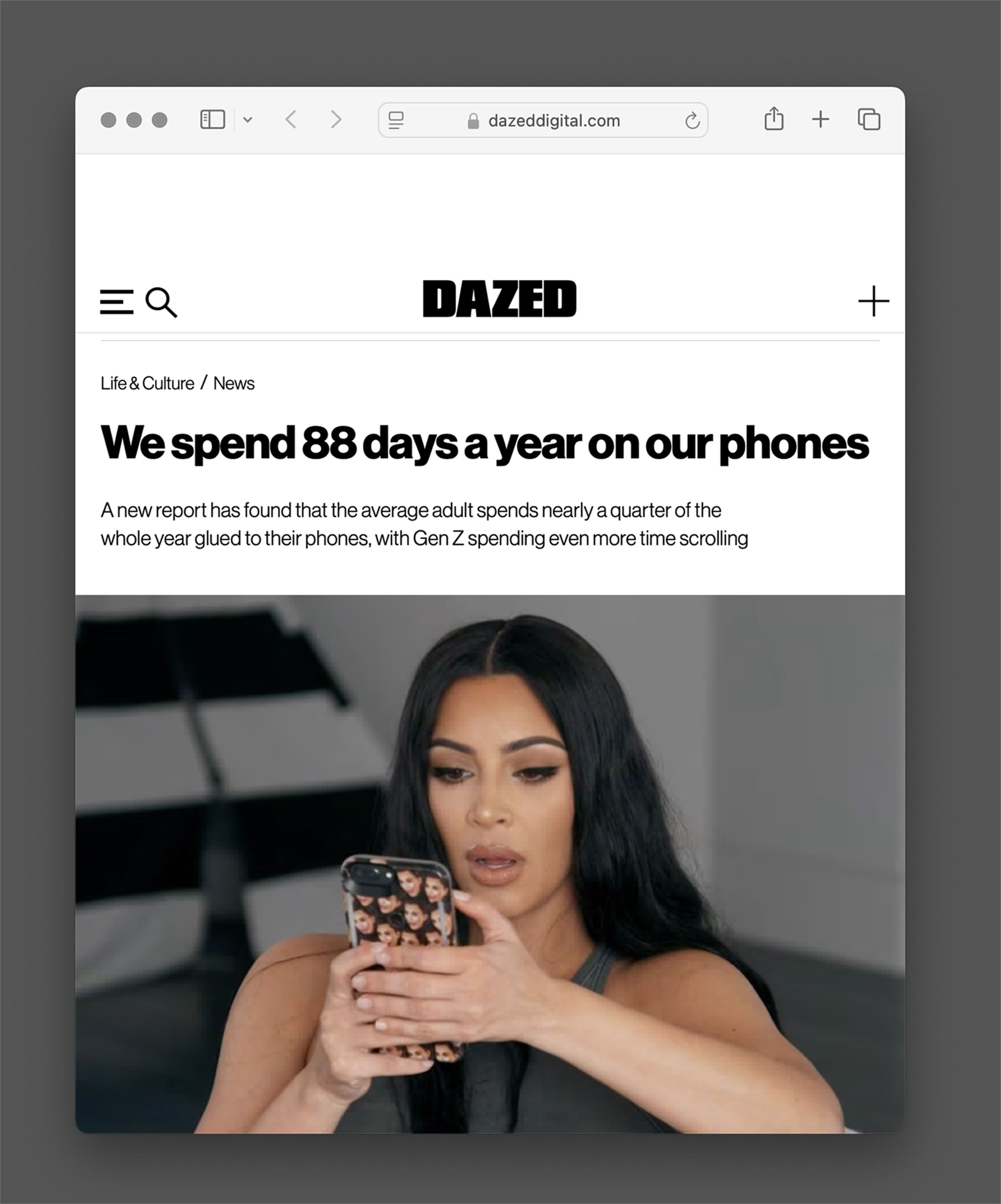 LPS: Screenshot of Dazed article featuring an image of Kim Kardashian scrolling on her phone, published on 25 April 2025, viewed on Safari on 5 February 2026. The article refers to recent U.S. and UK statistics according to which the average time spent on phone screens amounts to 88 days per year for millennials, and up to 120 days for Gen Z and Gen Alpha.