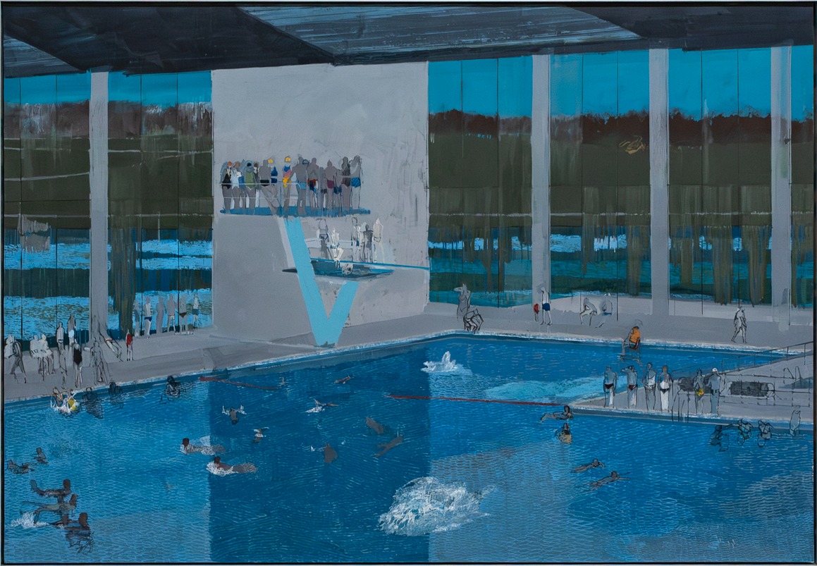 Anderson’s work questions the nature of reality, paintings show the pictorial techniques used in their construction, and the grid underdrawing used to scale the composition is often left or re-applied over the painting. In this sense, his work is far from a ‘trompe l'oeil’ (or trompe l’acrylic in the case of Anderson), it is not hyper-realism. In contrast, it is painting which questions the ‘truth’ of photography. Like water, reality is fluid and as intangible as memory. Paintings such as ‘Audition 1998’, depicting Anderson’s local municipal pool, were created using photomontage, scaled to create an accurate representation, but combined with a ghostly, painterly approach to figuration. With a muddied palette evoking faded recollection or perhaps nostalgia.