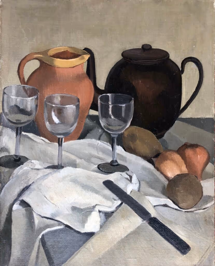 Hepworth and Preece spent four years in Paris, where the influence of Andre Derain, Jean Marchand and Andre Lhote can be seen on Hepworth’s still lives with their vibrant colours, angular and rhythmic shapes and new perspectives. Preece arranged the fruit, wine bottles and objects for Still Life with Fruit and Bottles (c.1927), Still Life (c.1925) - canvas laid on board flattening the perspective even further - and Still Life With Teapot (c.1927). Echoes of ‘painters of the interior’, such as Gwen John and the Camden Town Movement, are also evident.