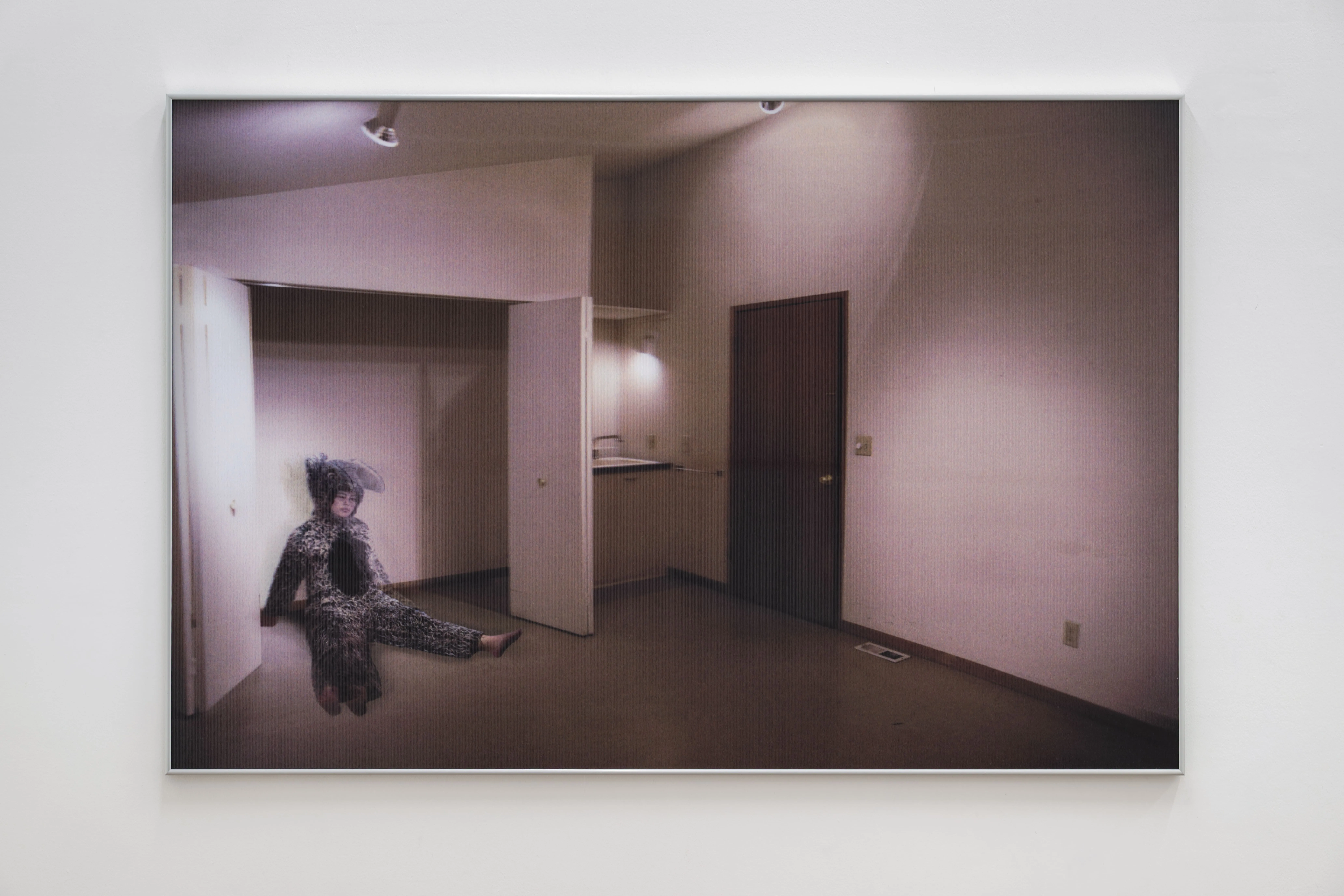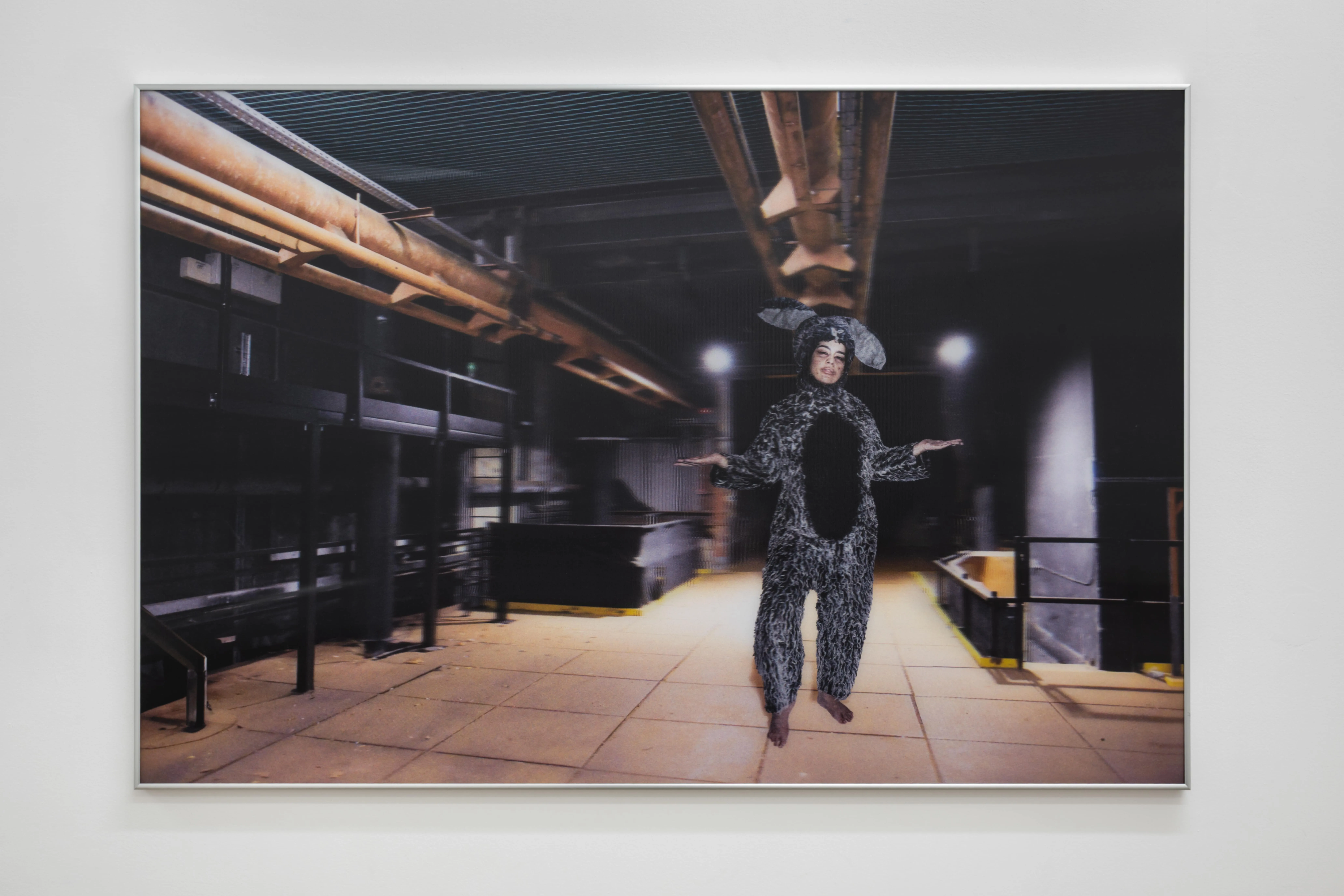 The prints you present in the exhibition combine three concepts: a rabbit-like Disney adult, liminal spaces, and a certain 90s album cover aesthetic: I love them. Can you tell me more about this character and the read thread connecting the three prints?