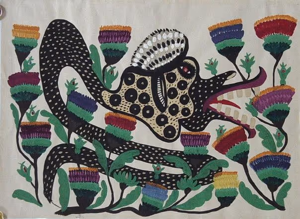 Whilst the Soviet leader Stalin sought to suppress Ukrainian folk traditions, in Kyiv, they still flourished; As both a woman, and a peasant, she was perceived to pose particularly little threat. Here, she painted animals for the first time. Challenging her contemporary mythologisation or Balkanisation as a village-based fantasist, it was also here she first visited a zoo and began her engagement with global art and politics.