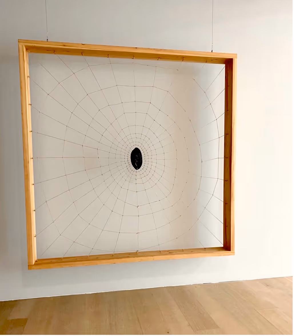 In this exhibition, the first work encountered is Obsession, which consists of a pencil case with an open mouth in the centre of a wooden frame and linen threads resembling a spider web around it. The leather pencil case, which forms the focus of the work and resembles the female genitalia, signifies the excitement of the act of creation as well as the attraction of discovery, while the threads surrounding it create a tense appearance resembling a dangerous trap. With this work, Çekil establishes an analogy between sexuality and reproduction by associating the pleasure of reproduction with a sexual object, revealing the mysterious side of reproduction and drawing attention to the dangerous and tense aspects of this act.