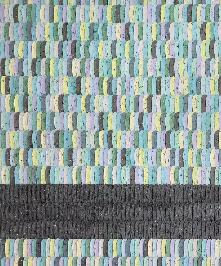 In these processes, I follow a circular economy policy that allows me to reduce the amount of waste generated, establish dialogues between different works, and generate a more elastic and sustainable practice. The first step of this process is to create a dough with air-dry clay, PVA, acrylic, and waste materials. Once the matter is almost dried, I use an electric food slicer to fragment it mechanically into slices, displayed from left to right, top to bottom. It is a simple and mechanical process that embodies complex political content in its materiality and methodology.