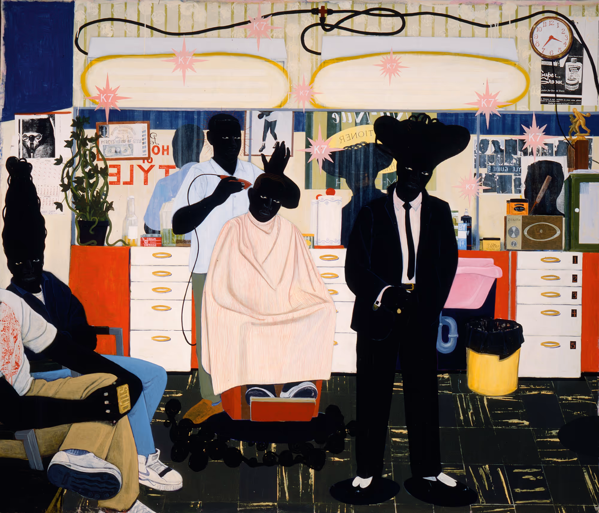 Glitter becomes a prominent feature in Marshall’s later series, such as ‘Souvenirs’ and ‘The Painting of Modern Life II’, his body of work from the 2010s. School of Beauty, School of Culture 2012 is a tableau of a beauty school — a significant social institution within African American communities — and a companion piece to his earlier painting, De Style (1993). Sleeping Beauty’s anamorphic head floats off the floor, recalling the skull in Hans Holbein the Younger’s painting The Ambassadors 1533. Everyone in the painting, except for two young children, seems unfazed by it.