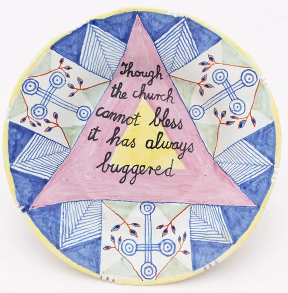 Nel plays with his medium with the whimsy of David Shrigley. Some plates simply detail the meals he’s had to eat - ‘pickled tongue of beef and coarsly [sic] mashed potatoes. Quite nice.’ Others show biblical scenes. A thin glaze of contemporary politics covers them all: ‘Though the church cannot bless it has always buggered’.