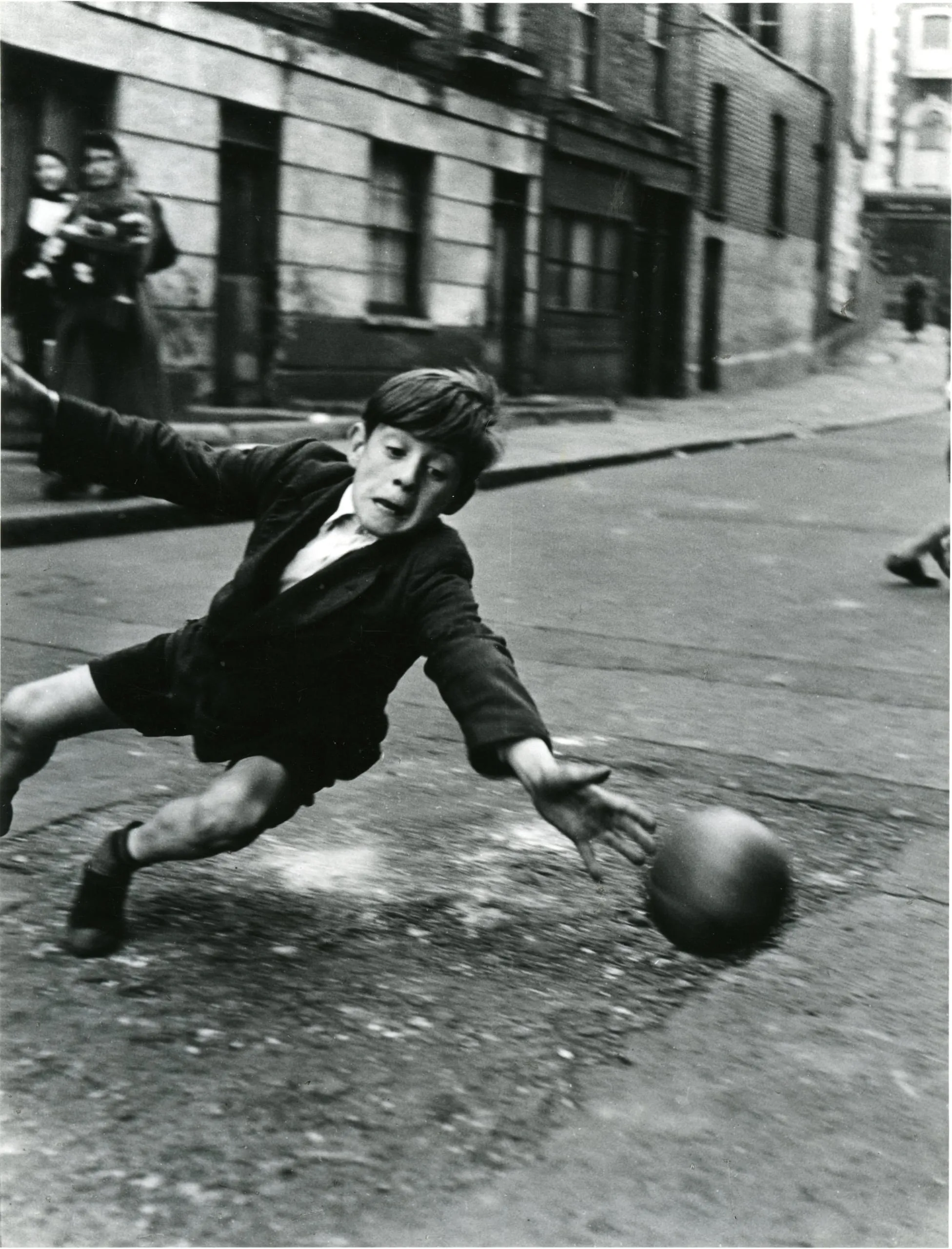 There is an image of a young boy playing football in Youth, an exhibition of post-Second World War photographs taken by Roger Mayne. Situated in the first exhibition room, on the third floor of the Courtauld Gallery, this framed, modern print is titled Goalie, Brindley Road, Paddington (1956) and, like all the black and white photographic prints in this exhibition, focuses on the streets of 1950s London. The image of the boy is dynamic: he jumps across the print to catch the ball, wearing a shirt, blazer and shorts, positioned in the middle of a dark, derelict street. The boy’s face is completely absorbed in the game, juxtaposed with his situation and the reality of growing up in post-war Britain (1945-1979). Featured on the cover of The Observer in August 1956, this image vividly captures the global unrest occurring just months before the Hungarian Revolution began in October of that year.