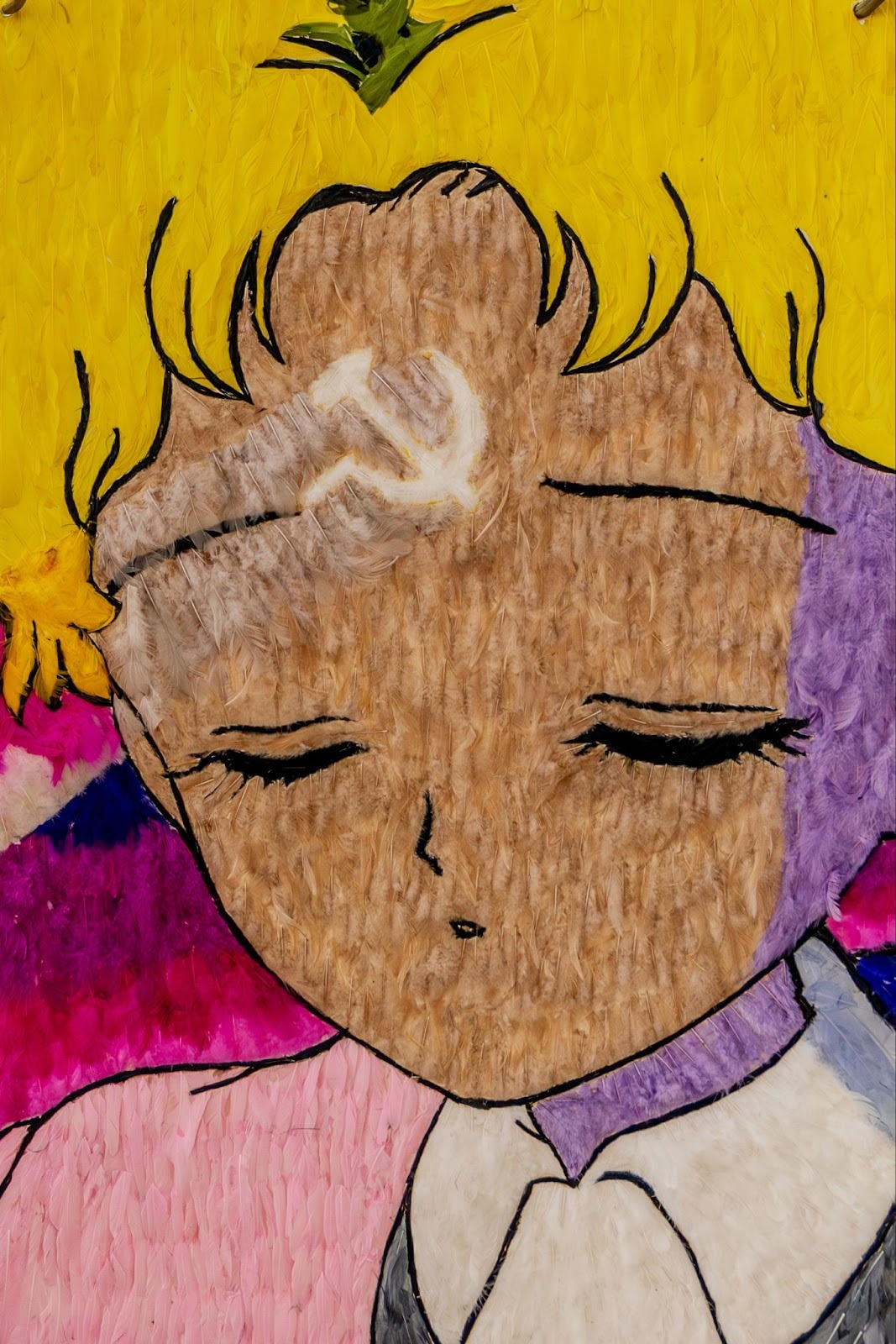 Sailor Moon: For example, I recently created a large feather mosaic called Sailor Moon Communist, which I showed in Paris. I continue to transform these practices, drawing on Art Nouveau and Art Deco references, while keeping pre-Columbian divinities in view. These works are part of my idea of an arte total, similar to what the Art Nouveau movement aimed to achieve.