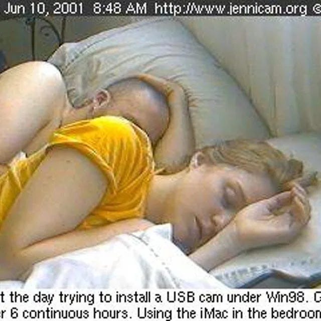 She's called Jenny Cam. There’s a podcast I really enjoy, and I've been quite into it over the past year, called Panic World. Their whole focus is on how the Internet has shaped modern politics and culture. They did a whole episode about Jenny Cam. She was an American woman who, in the late 90s, set up a webcam in her university dorm room that took a photo of her or the room every 10 minutes and posted it online. She then gained a fan base, mainly men, who would check for updates on, like, what Jenny Cam was doing in her bedroom today. There was obviously a sexual dimension to it. Still, it also serves as an interesting example of how people experimented with the internet as a way of breaking down some kind of boundary between private and public, and maybe why we do that.