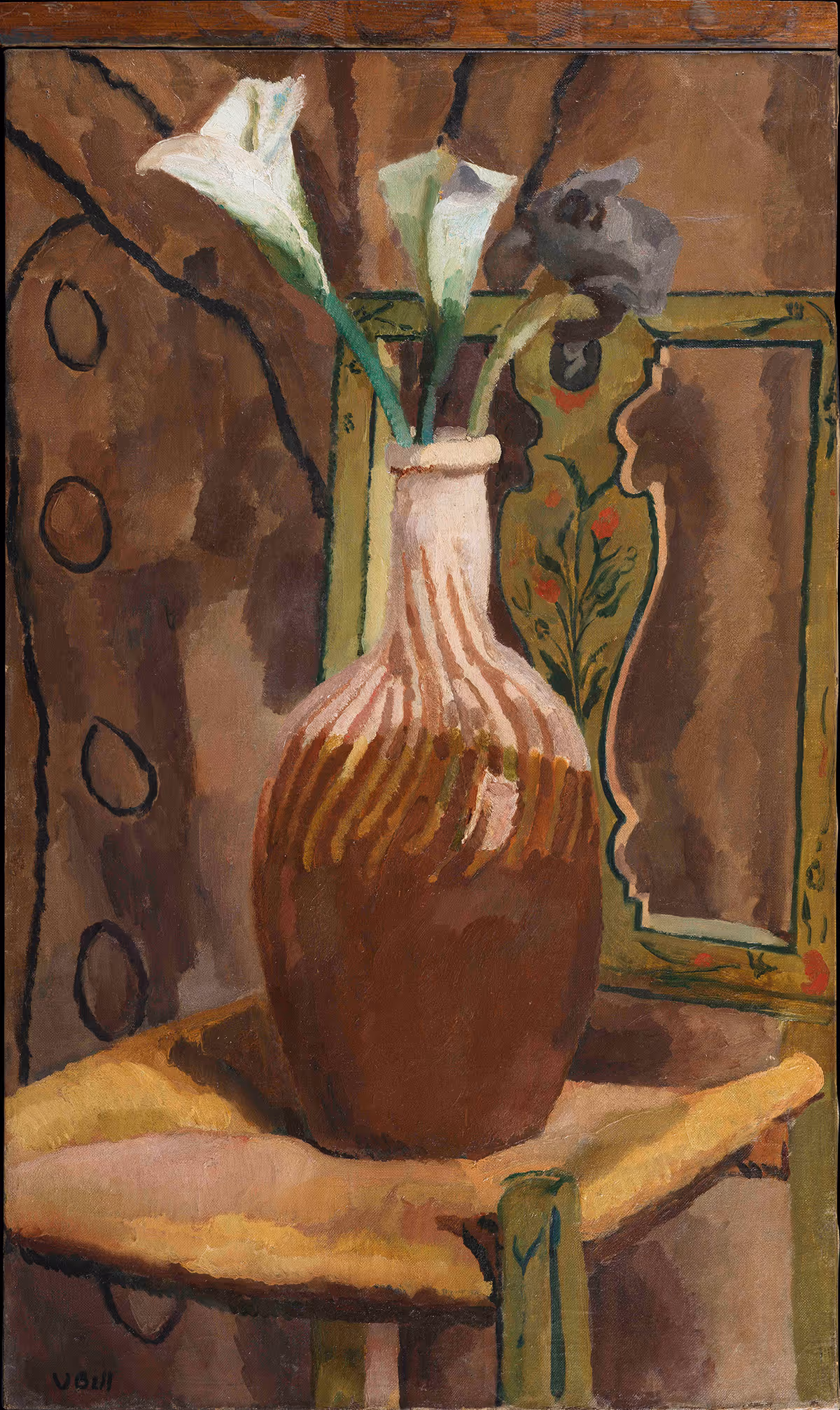 The painting Arum Lilies and Iris (c.1919) illustrates this point; Bell, like Ruskin and Morris before her, saw art in domestic objects and spaces. The Omega Workshop wanted to bring decorative and Fine Arts together, and this still-life is far more a painting of a vase and chair than it is of the lilies. The iris is barely distinguishable, with much more attention paid to the delicate depiction of the hand-painted rush-seated chair.