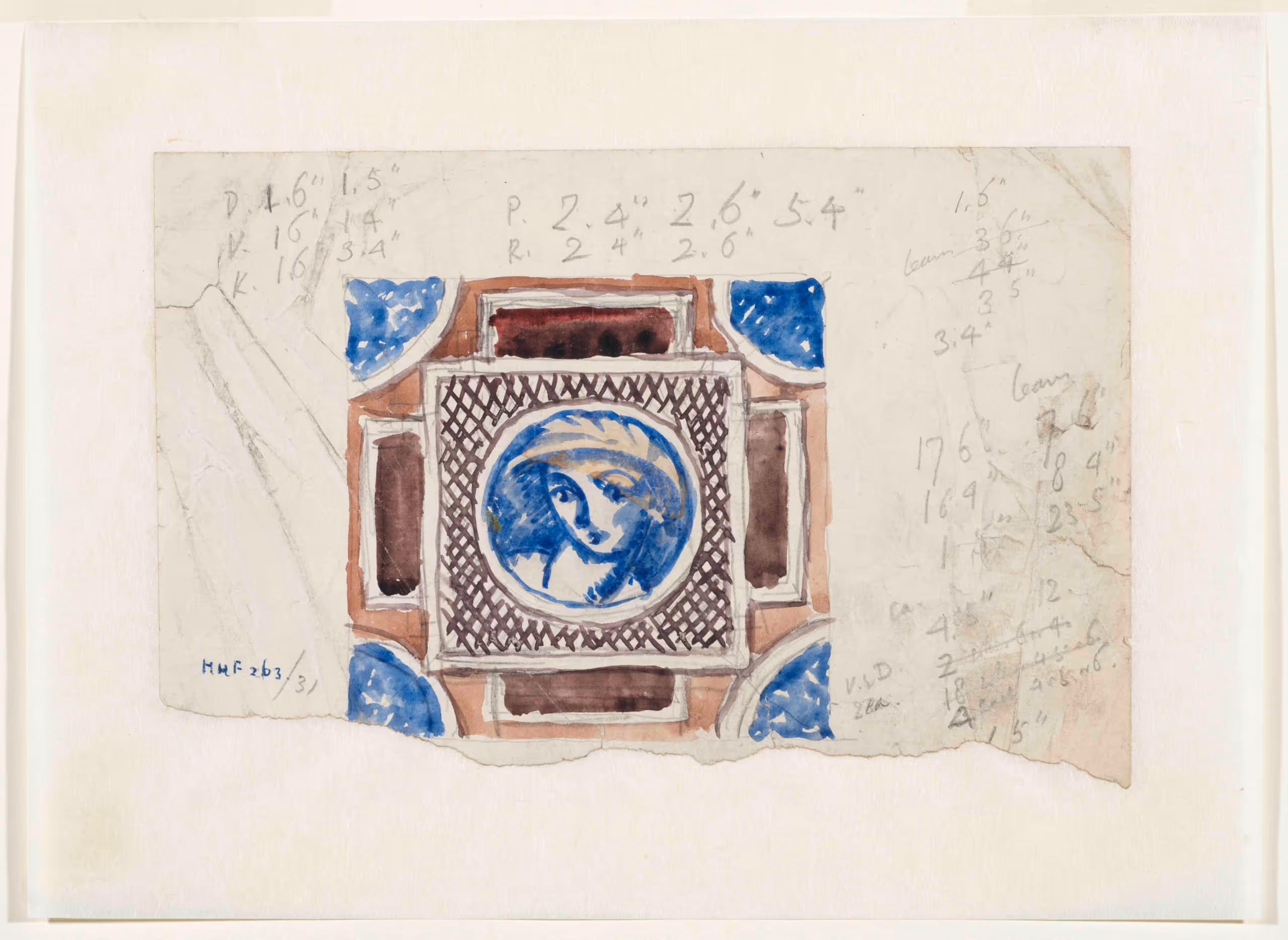 Perhaps for this reason, Bell was interested in mosaic and tiles and worked on several designs with Grant now in the Courtauld’s collection. Bell also looked to Papiers collés, using pieces of paper in her preparatory sketches for designs. Torn paper made it possible to rework with blocks of colour, creating these vital compositions, borne of the Workshop’s ‘relaxed and practical approach’ to use the curator’s own words.