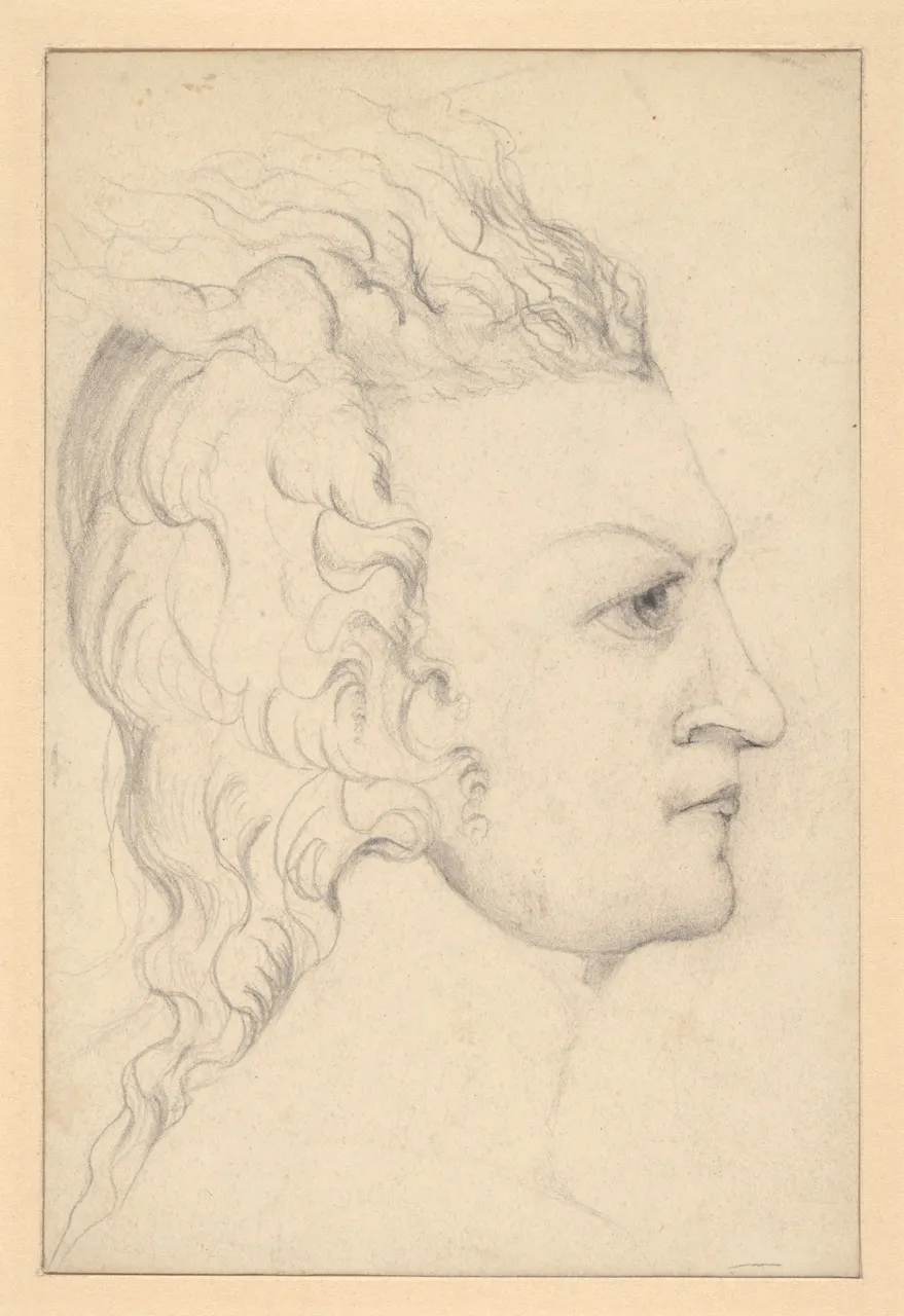 Blake was friends with Swiss-born artist Henry Fuseli, who settled in England in 1779, and they shared a radical publisher, Joseph Johnson. Fuseli’s Self Portrait (1780s), in black and white chalk on buff paper, is one of the show’s opening works. The melancholic expression, with the artist’s face held in sketchy hands, can be compared with Catherine Blake’s likely posthumous portrait of her husband as a young man, produced around 1830. Made after Blake’s death, it is one of the few surviving artworks by Catherine. Using graphite on paper, she imagines her husband with hair-like flames coming out of his head, the source of his visions.